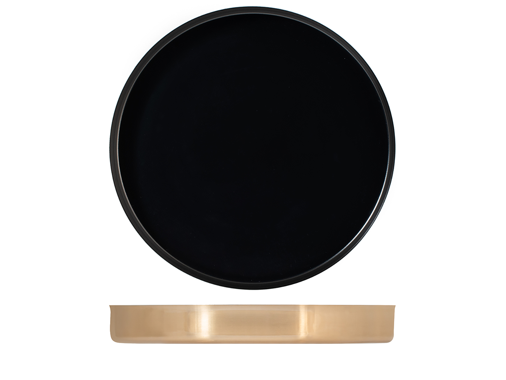 Tava din otel inoxidabil si rasina, rotunda, culore negru in interior si auriu pe exterior, excelenta pentru o servire rafinata.